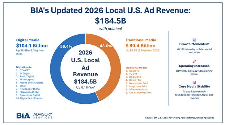 BIA Revises 2026 Local Ad Forecast To Reach Total Spend Of $184.5 Billion; Appx. 8.1% YOY Growth