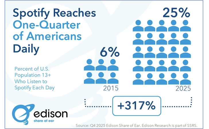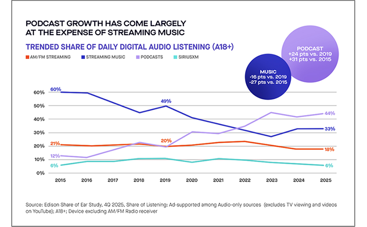 JOCKLINE, DECEMBER 12TH, 2025 – Westwood One's analysis of Edison Research’s Q3 “Share of Ear.” study of 4,000 Americans shows that AM/FM radio still dominates ad-supported audio with a 64% share, followed by podcasts (20%). Ad-supported music streaming platforms have audience shares in the low to mid-single digits: Spotify (6%), Pandora (5%), YouTube Music (1%), and Amazon Music (1%).