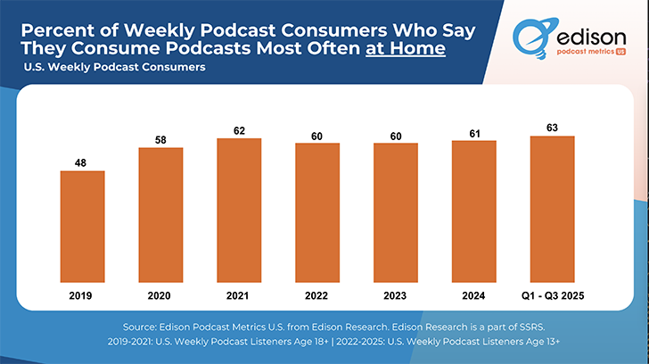 JOCKLINE, JANUARY 8TH, 2026 – In Edison's latest 'Insights,' it says the majority of audio listening remains at-home, but we now see a shift back towards pre-COVID levels. Our first insight of 2026, from Edison Podcast Metrics, illustrates where U.S. weekly podcast consumers most frequently consume podcasts and how this specific sector of the audio world has changed over time. J Just as we saw last week, the COVID-19 pandemic significantly changed where weekly podcast consumers listen to or watch podcasts most often. In 2019, 48% of weekly podcast consumers said they listened to podcasts most often at home. The number jumped significantly to 58% in 2020. In the case of podcasts, at-home has continued to rise over time, with 63% of weekly podcast consumers picking that as their primary podcast consumption location. Parallel trends around podcast consumption, especially on TVs, are likely keeping these numbers from reverting to the pre-COVID rates. Click the image to enlarge Edison Podcast Metrics is the only podcast measurement service that captures consumption across all networks, shows, and platforms in the U.S. Subscribers to this product have access to all of our research, rankings, and show profiles through online dashboards—including comprehensive rankings for 500+ podcasts with detailed insights across thousands of shows.
